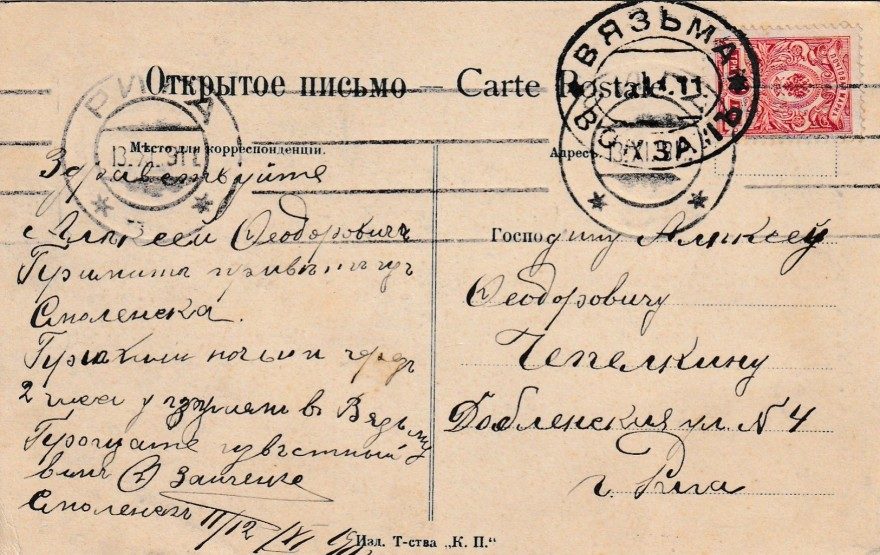Здравствуйте Алексей Феодорович Примите привет из Смоленска. Приехали ночью и через 2 часа уезжаем в Вязьму Прощате [^прощайте] известный вам Занченко Смоленск 11/12 /XI 1911 г.