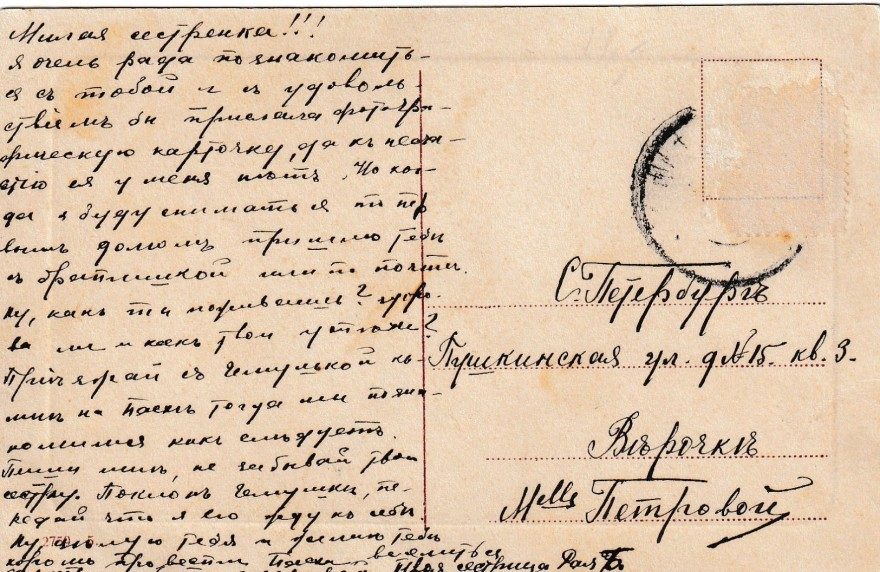 Милая сестренка!!! Я очень рада познакомиться с тобой и с удовольствием бы прислала фотографическую карточку, да к несчастью ее у меня нет. Но когда я буду сниматься то первым домом пришлю тебе с братишкой или по почте. Ну, как ты поживаешь? Здорова ли и как твои [?устали]? Приезжай с Чемулькой ко мне на Пасхе тогда мы познакомимся как следует. Пиши мне, не забывай твою сестру. Поклон Чемушке, передай что я его жду к себе. Ну, целую тебя и желаю тебе хорошо провести Пасха [^Пасху], веселиться [нрзб] Твоя сестрица Рая Т.