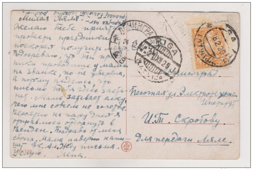 {Открытка изображает благод[етельное]. действие радио.} Миля Ляля. Желаю тебе приятно провести празднование поскорее получить место. Подозреваю, что ты праздники проводишь у мамы на званке, но не уверена, а потому надеюсь, что письмо тебя здесь застанет. Мама затевает елку, чего мне совсем не хочется. Вероятно на пару дней я отправлюсь отдохнуть в Венден. Поздравь от меня своих. Мама наверное напишет Ек. Ал. Жду письмо. Целую. Лена