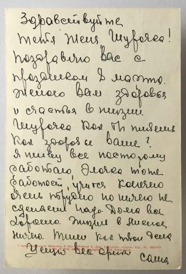 Здравствуйте тетя Женя Шурочка! Поздравляю Вас с праздником 8 марта. Желаю Вам здоровья и счастья в жизни. Шурочка как ты живешь Как здоровье Ваше? Я живу все посторому[^по-старому] работаю, Элочка тоже работоет[^работает], учится конечно очень трудно но ничего не сделаешь надо. Дома все хорошо. Жизнь в Лиепае ничего. Пиши как твои дела Целую Вас крепко Саша
