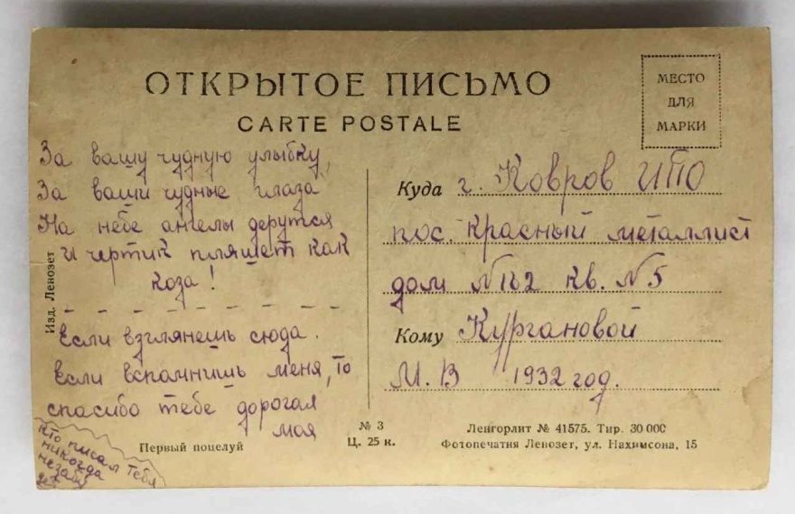 За вашу чудную улыбку,За ваши чудные глаза На небе ангелы дерутся И чертик пляшет как коза! Если взглянешь сюда. Если вспомнишь меня, то спасибо тебе дорогая моя {кто писал тебе никогда не забудет} {1932 год.}