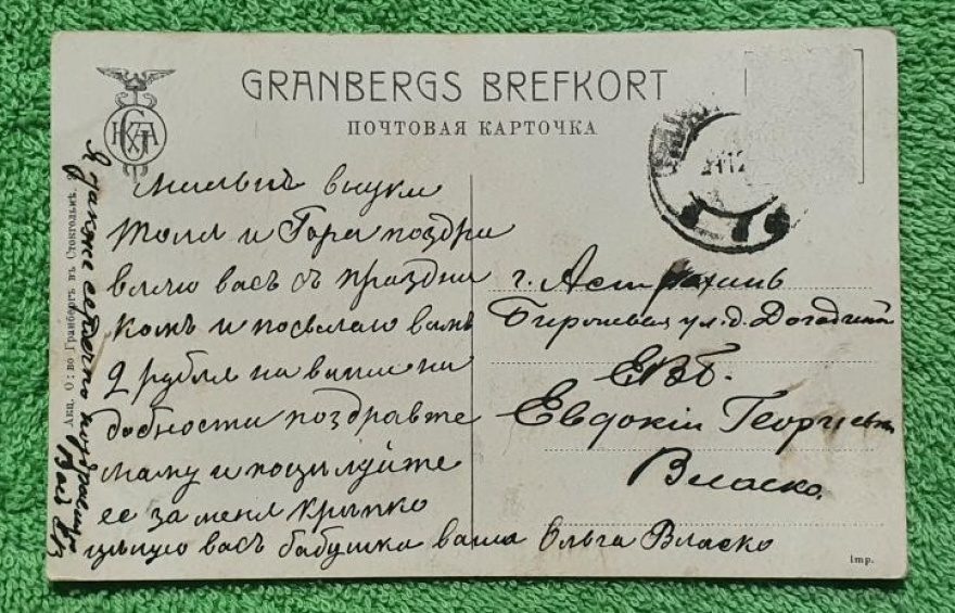 Милые внуки Толя и Гора поздравляю вас с праздником и посылаю вам 2 рубля на выписки [?добности] поздравте [^поздравьте] маму и поцилуйте [^поцелуйте] ее за меня крипко[^крепко] цилую[^целую] вас бабушка ваша Ольга Власко {Я также сердечно поздравляю Вас ЕВ}
