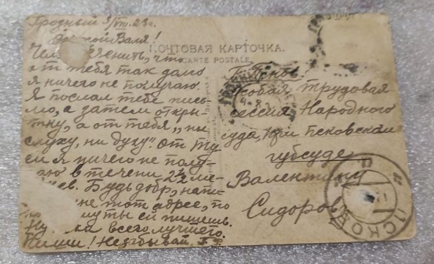 Грозный. 3/VIII. 23 г. Дорогой Валя! Чем [!объ]яснить, что от тебя так долго я ничего не получаю. Я послал тебе письмо, а затем открытку, а от тебя "ни слуху, ни духу". От Туси я ничего не получаю в течени [^течение] 2 1/2 ме[!сяц]ев. Будь добр, напи[!ши] [!м]не тот адрес, по ко[!торо]му ты ей пишешь. Ну [!по]ка всего лучшего. Пиши! Не забывай Г. Ф.