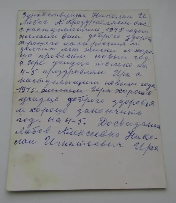 Здравствуйте Николай И. Любов [^Любовь] А. Поздравляем вас, с наступающим 1945 годом. Желаем вам доброго здоров[ья] хорошего настроения и долгих лет жизни и хорошо провести новый год а Ире учидца [^учиться] только на 4-5 поздравляю Иры [^Иру] с наступающим новым годом 1945. Желаем Ире хорошо учидца [^учиться] доброго здоровья и хорошо закончить год, на 4-5. До свидания Любов [^Любовь] Алексеевна Николай Игнатьевич Ира