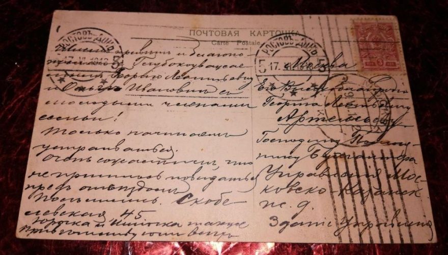 Шлем привет и благопожелание Глубокоуважаемым Георгию Леонтьевичу и Ольге Ивановне с молодыми членами семьи! Только начинаем устраиваться. Очень сожалеем, что не пришлось повидаться пред отъездом. Поселились. Скобелевская, 45. Ирочка и Ниночка также приветствуют всех