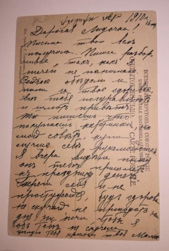 {[нрзб] [нрзб] 1910 г. 16 апр.} Дорогая Лидочка! Письма твои все получила. Пиши разборчивее так, как я ничего не понимаю. Сейчас обедали и пили за твое здоровье, все тебя поздравляют и шлют привет. Ты пишешь, что покупаешь картинки, но мой совет, купите лучше себе рукомойник. Я вчера видела папу он тебе пришлет к празднику денег. Береги себя и не простужайся, будь здорова, не скучай, не проходит ни дня, ни ночи, чтобы я об тебе не скучала. целую тебя крепко твоя Мама
