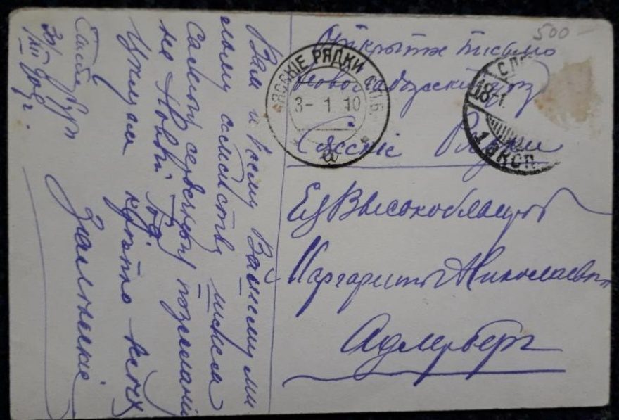 Вам и всему Вашему милому семейству шлем самые сердечные пожелания на Новый Год. Целуем крепко всех 30/XII 1909 г[од]