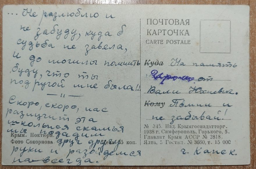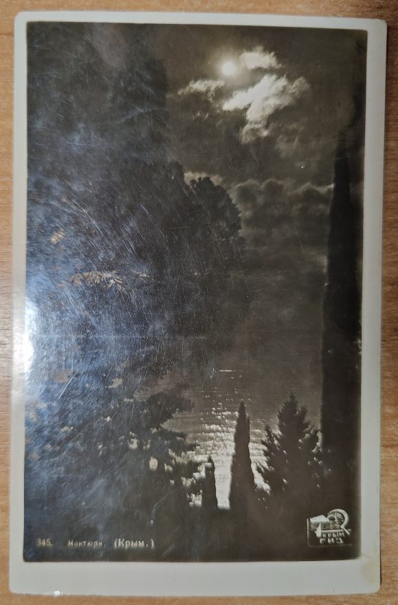 Описание открытки: Цена 35 коп. №345. Изд. Крымгосиздатторг. 1938 г. Симферополь, Горького, 5. Главлит Крым АСССР №2818. Ялта, 5 Гостип. №3600, т. 15 000