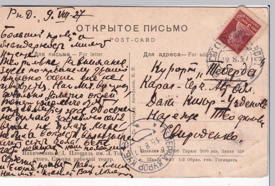 Рно. 9. VIII - 27 Большой привет и благодарность милой Надежде Теофиловна за внимание. Здесь по-прежнему душно [..лоно]осени еще не [?цвететут]. Наш Мих.[аил] верится довольно заметно окреп, теперь уже легче будет оправляться здесь. Об осени не думаю, заставляю себя [вя..] не думать. Негде [^Нигде] не была в окрести [^окрестности], [нрзб] себя дома! [Бе..] часто навещает наш [^наше] помещение. Сердечный привет Павлу Алексеев[ичу] и Егорке. [Ни] Мих. [..ча...ет] Ваш [нрзб]