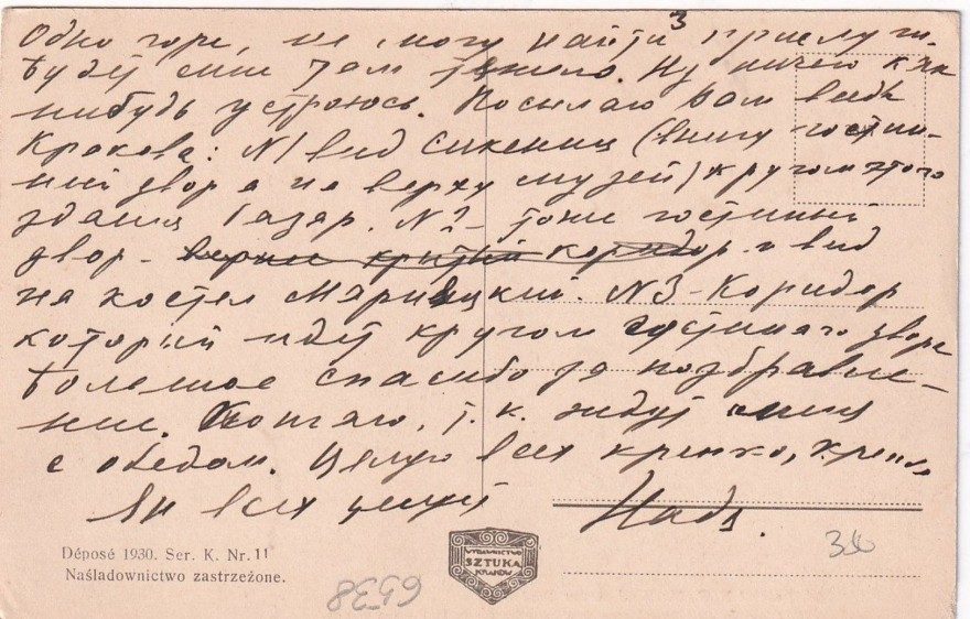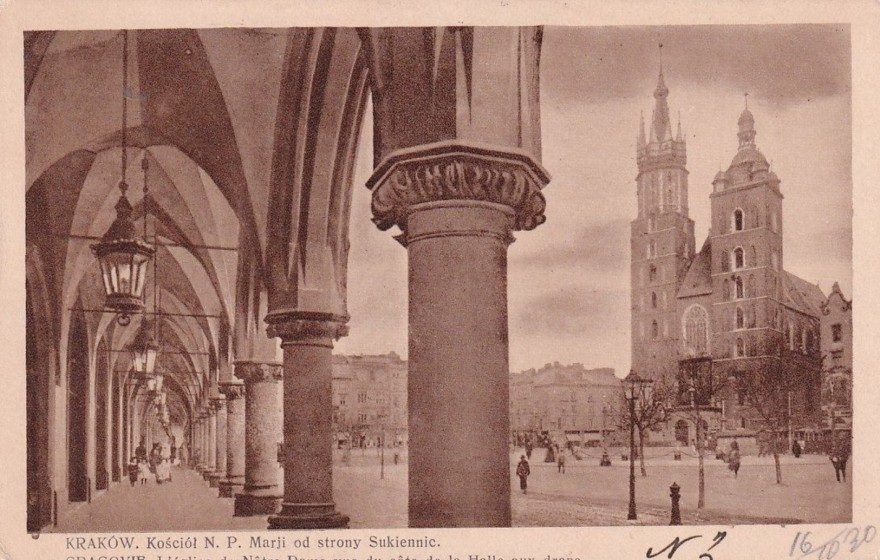 Одно горе, не могу найти прислуги. Будет мне там тяжело. Ну ничего как нибудь устроюсь. Посылаю Вам виды Кракова: N1 вид Сикениц (внизу гостинный двор а на верху музей) кругом этого здания базар. N2 - тоже гостинный двор - вернее крытый коридор - и вид на костел Марищкий. N3 - Коридор который идет кругом гостинного двора. Большое спасибо за поздравление. Пошлю, т.к. ждут меня с обедом. Целую всех крепко, крепко. Вас всех целую Надя.