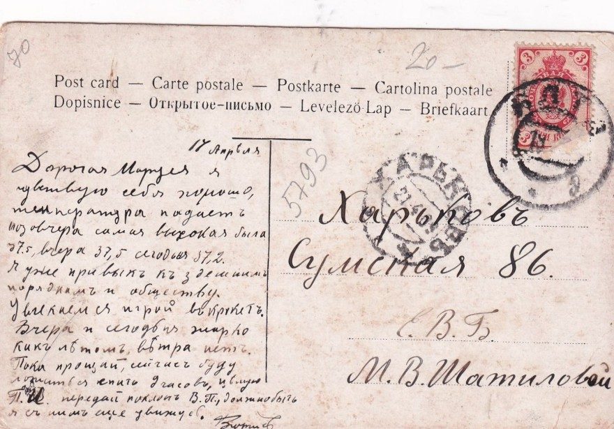 {17 апреля} Дорогая Маруся я чувствую себя хорошо, температура падает позавчера самая высокая была 37.5, вчера 37,5 сегодня 37,2. Я уже привык к здешним порядкам и обществу. Увлекся я игрой в крекет [^крикет]. Вчера и сегодня жарко как летом, ветра нет. Пока прощай, сейчас буду ложиться спать 9 часов, целую П. И. передай поклон В. П., должно быть я с ним еще увижусь.