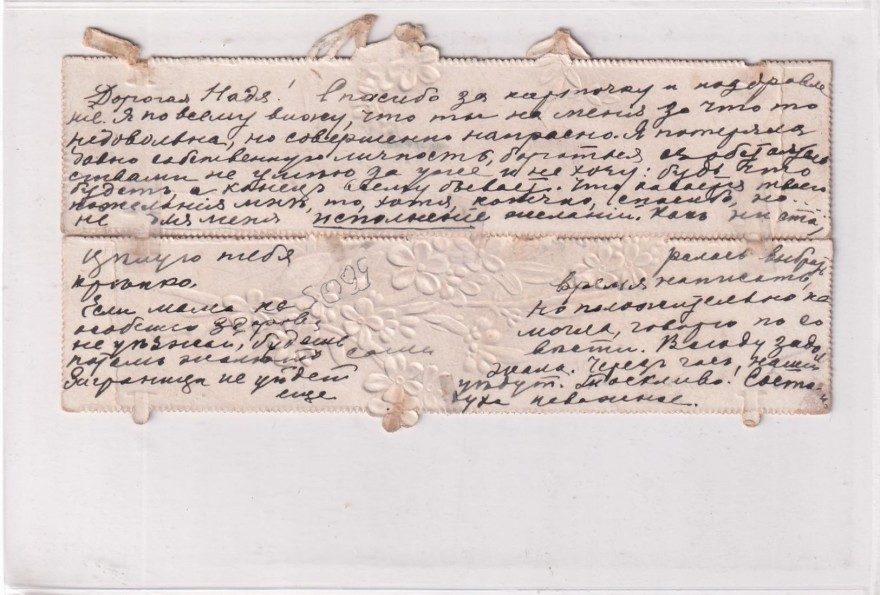 Дорогая Надя! Спасибо за карточку и поздравление. Я по всему вижу, что ты на меня за что то недовольна, но совершенно напрасно. Я потеряла давно собственную личность, бороться с обстоятельствами не умею да и уже и не хочу: будь что будет, а конец всему бывает. Что касается твоего пожелания мне, то, хотя, конечно, спасибо, но... не для меня исполнение желаний. Как ни старалась выбрать время написать, но положительно не могла, говорю по совести. Владу задолжала. Через час, наши уедут. Тоскливо! Состояние духа неважное. Целую тебя крепко, Если мама неособенно здорова, не уезжай, будешь потом жалеть сама Заграница не уедет еще