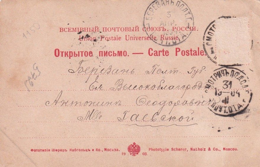 Описание открытки: ФОТОТИПИЯ Шерер Набгольц и Ко., Москва 19 03. Phototypie Scherer, Nathoiz & Co., Moscou.