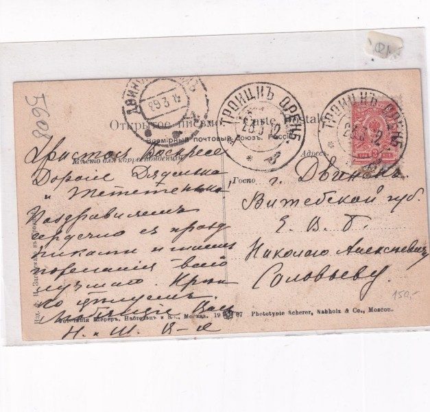 Христос Воскресе! Дорогие Дяденька и Тететенька[^Тетенька]! Поздравляем сердечно с праздниками и шлем пожелания всего лучшего. Крепко целуем. Любящие Вас. Н. и Ш. Ц-е