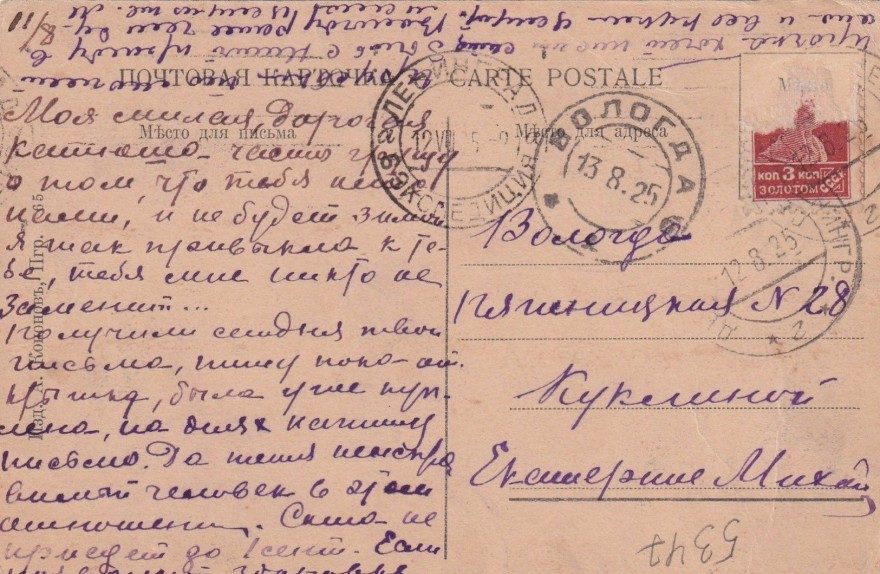 11/8 Моя милая, дорогая Катюша часто грущу о том, что тебя нет с нами, и не будет зимой. Я так привыкла к тебе, тебя мне никто не заменит... Получили сегодня твои письма, пишу пока открытку, была уже куплена, на днях напишу письмо. Да тетя неисправимый человек в этом отношении. Саша не приедет до 1 сент[ября]. Если [нрзб] здоровье. {Ирочка хочет писать сама она и все куклы целуют.} {Ируська то может 3 окт[ября] с Ниной приеду в Вологду ранее чем думала целую тв[оя] М.}