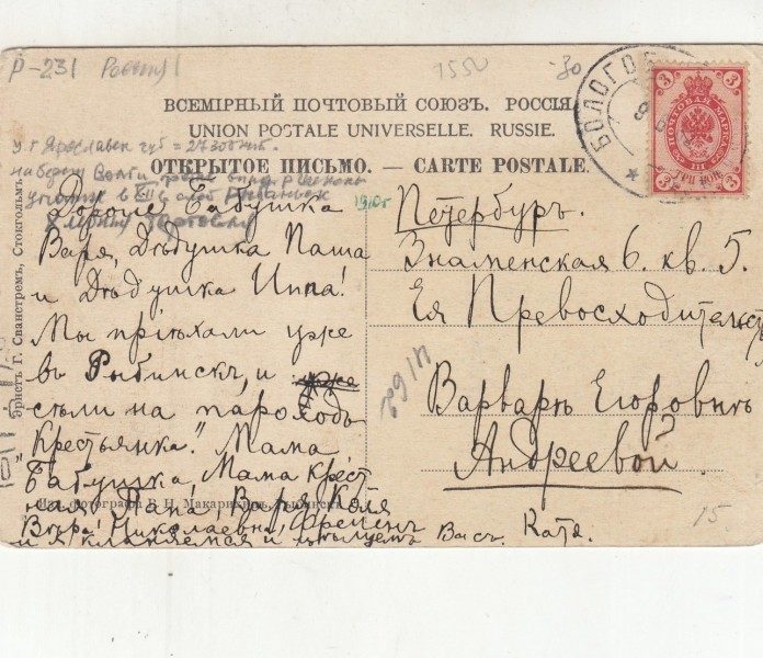 Дорогие Бабушка Варя, Дедушка Паша и Дедушка Иппа! Мы приехали уже в Рыбинск, и уже сели на пароход “Крестьянка”. Мама, Бабушка, Мама Крестная, Папа, Варя, Коля, Вера Николаевна, Фрекен и я кланяемся и целуем Вас. Катя. {P-231 [нрзб]} {у г. Ярославск. губ = 27 300 [нрзб]. на берегу Волги против впад р. [нрзб] в XII в слой Рыбинск X летняя торговля}