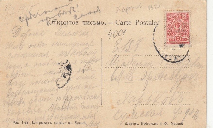 Описание открытки: Изд. Т-ва. "Контрагент печати" в Москве Шерер, Набгольц и Ко., Москва