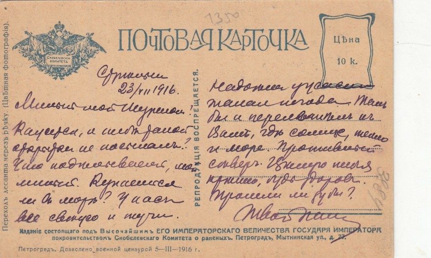 [?Строенцы]. 23/VII 1916. Милый мой ?шуринок! Кажется, я тебе домой открытки не посылал? Что ?поделываешь, мой милый. Купаешься ли в море? У нас все ?свежо и тучи . Надоже ужасна погода. Так бы и переехал к вам, где солнце тепло и мореНедалеко [нрзб]. Там был и перехотелось к Вам, где солнце, тепло и море. [?Прошивочий] отверг. Целую тебя нежно, губы здорово. Прошли ли губы? Твой .