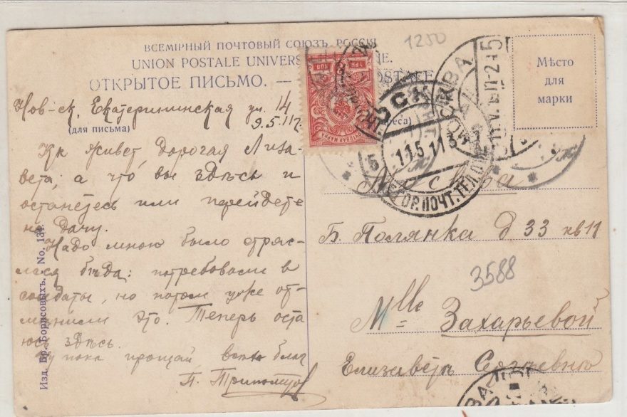 {У Пенайс[кого] маяка.} Нов-[ороссий]ск. Екатерининская ул. 14 9.5.11 г. Кк [^Как] живет, дорогая Лизавета; а что вы здесь и останетесь или перейдете на дачу. Надо мною было стряслася беда: потребовали в солдаты, но потом уже отменили это. Теперь остаюсь здесь. Ну пока прощай, всех благ П.