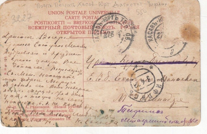 {Почта-Печать Хасов-ЮРТ Дагестат-Тифлис} Христос воскрес. Дорогая Екатерина Минаевна. Поздравляю с праздником и крепко целую Вас и деточек. Пожалуйста Ек[атерина] Мин[аевна] напишите мне адрес Маруси. Я забыла его. Вам наверное [хо...] Маруся, что я была [? у Н Я], а теперь не могу написать, т.к. не помню адрес. Петя Вам[*Вас] [?пламенно]и поздравляет. Любящие Вас Н. [Сан...]