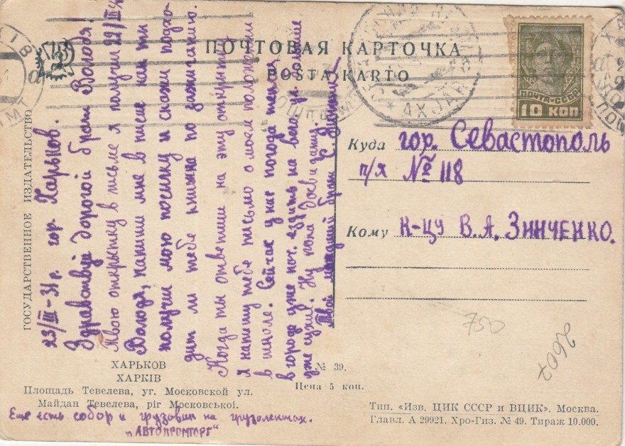 23/III-31 г. гор. Харьков. Здравствуй дорогой брат Володя. Твою открытку в письме я получил 22/III [?31]. Володя, напиши мне в письме как ты получил мою посылку и скажи подходит ли тебе книжка по зажиганию. Когда ты ответиш[^ответишь] на эту открытку я напишу тебе о моем положении в школе. Сейчас у нас погода теплая в городе уже хоч[у] ездить на вело[сипеде] ул[ицы] большие уже сухие. Ну пока досвидания[^до свидания]. Твой младший брат С. Зинченко {Еще есть собор и грузовик на грузолентах. «АВТОПРОМТОРГ»}