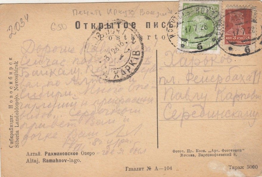 Дорогие Пава и Вера! Сейчас подъезжаю к Байкалу. Путешествовал по Алтаю и Сибири. Много впечатлений и прекрасных видов. Сердечный привет Вам и дочке Ваш А.Л. 17/VII 8 ч[асов] утра - где я был