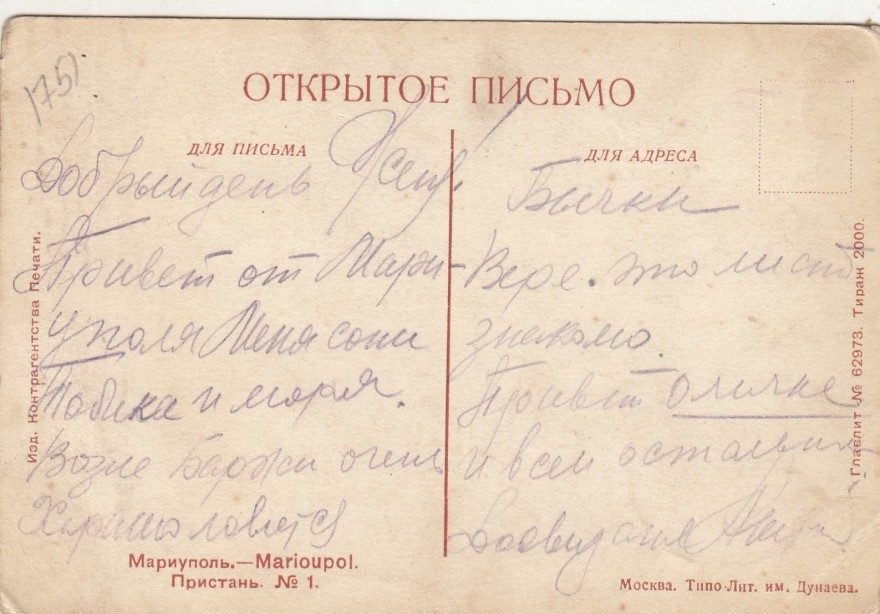 Добрый день Женя! Привет от Мариуполя Меня сони Толика и моря. Возле Баржи очень хорошо ловятся Бычки. Вере это [?лишь] знакомо. Привет Олечке и всем остальным. До свидания
