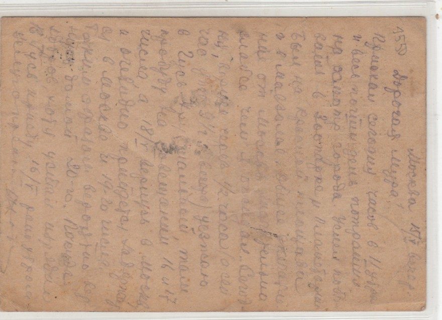 {Москва 15/V вечер.} Дорогая Мура! Приехал сегодня часов в 11 утра и весь почти день потратил на осмотр города. Успел побывать в Зоопарке и Планетарии Был на Красной площади и в мавзолее. Общее впечатление от Москвы значительно слабее чем я ожидал. Сегодня, [?всего] через 1/2 часа (а сейчас уже 9 1/2 вечера) уезжаю в Гусь Хрустальный, там пробуду на совещании 16 и 17 числа, а 18/V вернусь в Москву и очевидно прийдется [^придется] задержаться в Москве и 19-20 числа. Таким образом вероятно вернусь домой 20-го. Покуда здоров, хотя устал изрядно. В Гусь приеду 16/V рано утром. целуюкрепко [^целую крепко]