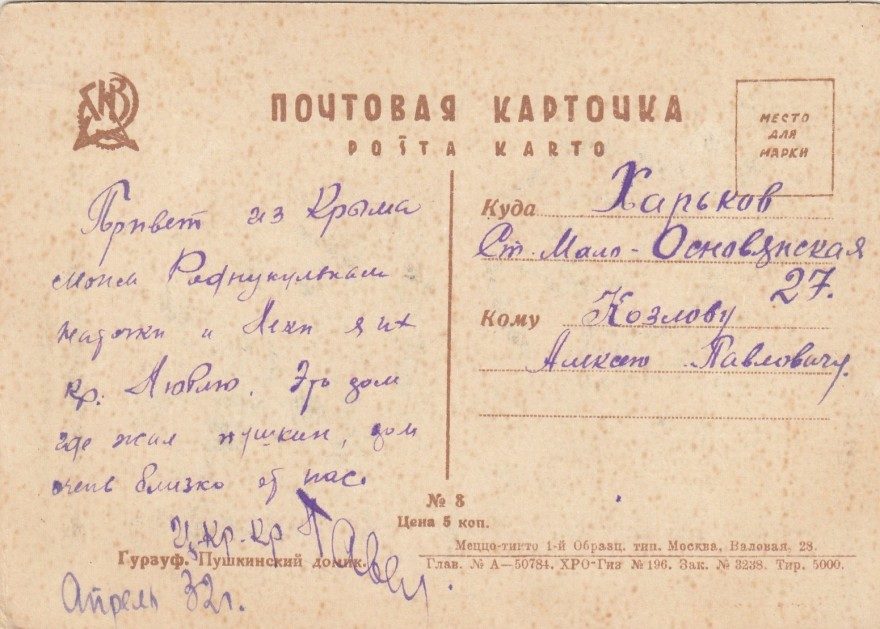 Привет из Крыма моим Роднулькам Наточки [^Наточке] и Лехи [^Лехе] я их кр[епко] Люблю. Это дом где жил пушкин, дом очень близко от нас. Ц[елую]. кр[епко]. кр[епко]. Павел {Апрель 32 г.}