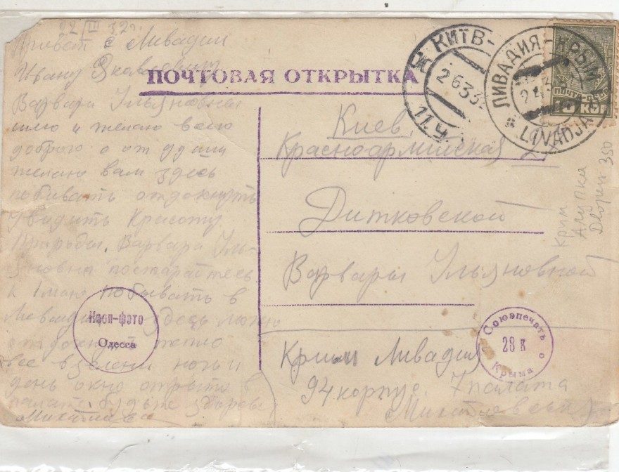 22/III 32 г. Привет с Ливадии Ивану Яковлевичу Варвара Ульяновна шлю и желаю всего доброго о от души желаю вам здесь побывать отдохнуть Увидить [^Увидеть] Красоту. Природы. Варвара Ульяновна постарайтесь. К 1 маю побывать в Ливандии здесь можно отдохнуть тепло все в зелени ночь и день окно открыто в палате, будьте здоровы Михайлова {Крим [^Крым] Алупка Дворец}