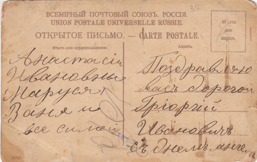 Поздравляю вас дорогой Григорий Иванович с днем анге[ла]. Анастасии Ивановны Маруся Ваня и вся семья