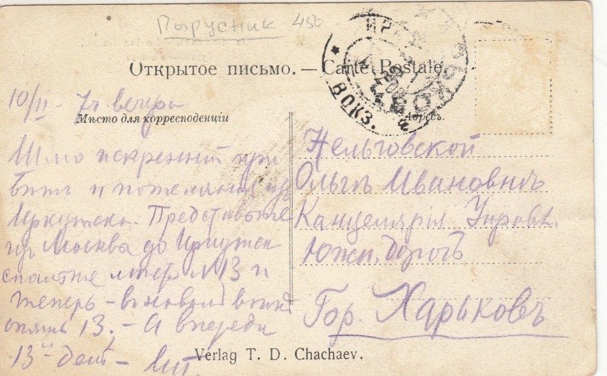 10/II - 7ч. вечера Шлю искренний привет и пожелания из Иркутска. Представьте из Москвы до Иркутск[а] спальня место №13 и теперь - в новый вагон опять 13. - а впереди 13и день. - Лит.