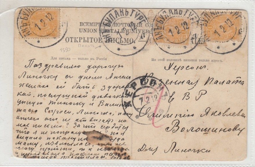 Дата отправления, штамп: 01 февраля 1912