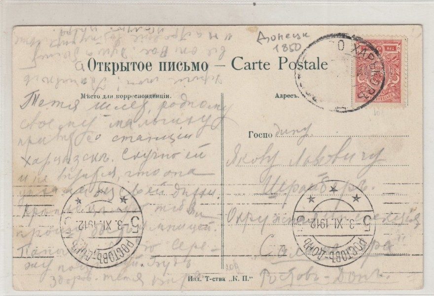 {Дорогие мои! Удаляюсь все от Вас. Душа болит и настроение возмутительное целую [?Вера]} Тетя шлет родному своему мальчику привет со станции Харцызск. Скучно ей и не верится, что она уехала без своей души. Крепко целую тебя и прошу быть умницей. Папочку и дядю Сережу поцелуй. Будь здоров. Тетя Вера