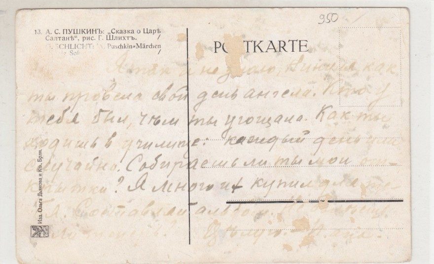 Я так и не знаю, Нинуля как ты провела свой день ангела. Кто у тебя был, чем ты угощала. Как ты ходишь в училище. Каждый день или случайна [^случайно]! Собираешь ли ты мои открытки? Я много их купил для тебя. Составляй альбом. Не болеешь ли теперь?