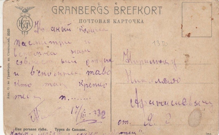 Ко[!х]аный Количка пасматри [^посмотри] и вспомни наш совместный отпуск и вспомни таво [^того] кто так крепко тебя п........ 17/VII - 33г {Крым. Гурзуф. [нрзб]}