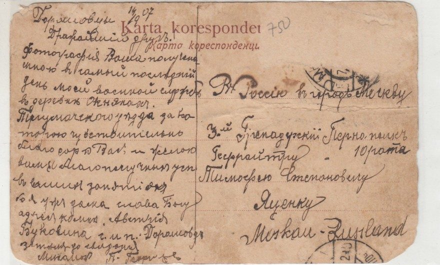 [?Доряновцы]. Дрожащий друг. Фотография Ваша получена мною в самый последний день моей военной службы в деревне Окняны Тлумачского уезда за которую чувстоительно благодаря вам и желаю благополучных усп[ехов] в ваших занятиях я уже даже глава Быу адрес комнат. Австрия Буковина с. м. п. Доролнову затем до свидания. [?Минаов] П. Генр[нрзб]ов. {Гуцулами называются те люди которые живут в Карпатских горах мы этой стороны в этом году имели Гористые маневры весьма тяжелые. И еще к тому из пушками полевыми и однако нельзя было вытащить в дождь подавленный. на этой горе Генерал Ма. Дивизионер и корп командант}