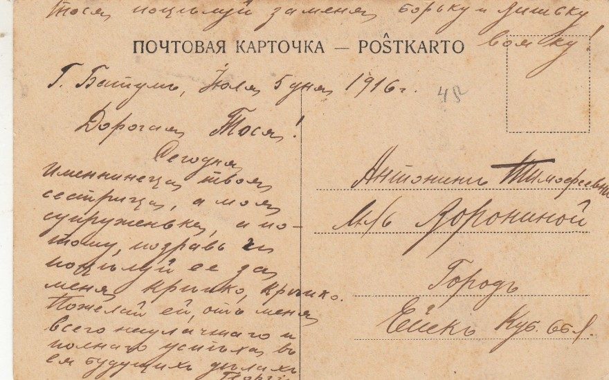 {Тося, поцелуй за меня, Борьку и [Ви...ку] [?вояку]!} Г[ород] Батум, Июля 5 дня 1916 г[ода]. Дорогая Тося! Сегодня именинница твоя сестрица, а моя супруженька, и потому, поздравь и поцелуй ее за меня крепко, крепко. Пожелай ей, от меня, всего наилучшего и полного успеха в ее будущих делах. Георгий.