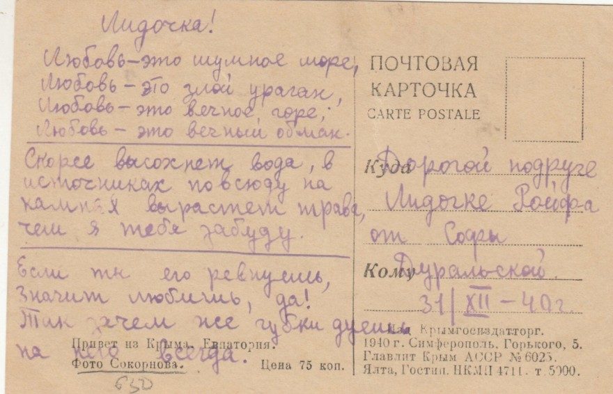 Описание открытки: Изд. Крымгосиздатторг. 1940 г. Симферополь. Горького, 5. Главлит Крым АССР №6025. Ялта, Гостип. НКМП 4711. т. 5000.