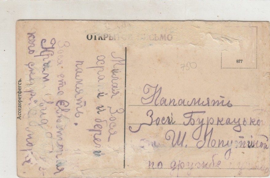 Милая Зося, храни и береги память. Зося это Евпатория Крым вид [...кого] [скар...] моря. {Напамять [^На память] Зоси Буркаулько от Ш. Лопутиной по дружбе}