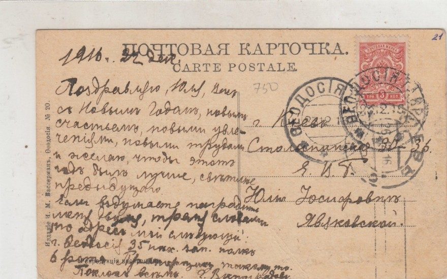 {1916 г. 22 дек[абря]} Поздравляю, Юля, Вас с Новым Годом, новым счастьем, новыми увлечениями, новыми трудами и желаю, чтобы этот год был лучше, светлее предыдущего. Если вздумаете наградить меня двумя, тремя словами то адрес мой следующий: г. Феодосия 35 пех[отный] зап[асной] полк в роту Прапорщику такому то [^такому-то]. Поклон всем. Г. Виноградов.
