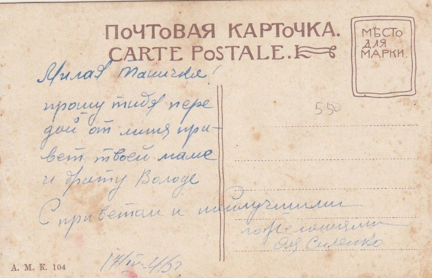 Милая Таничка! Прошу тибя [^тебя] передай от миня [^меня] привет твой маме и брату Володе. С приветом и наилучшими пожеланиями. Оля Силенко. {14/IV - 46 г.}