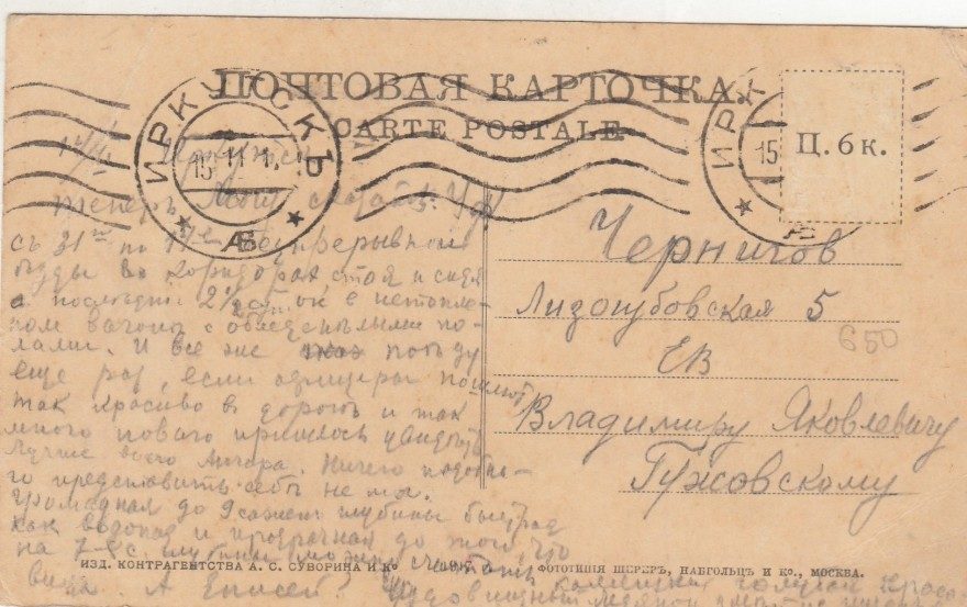 Описание открытки: Изд. контрагенства А. С. Суворина и Ко. 1917 г. Фототипия Шерер, Набгольц и Ко, Москва.