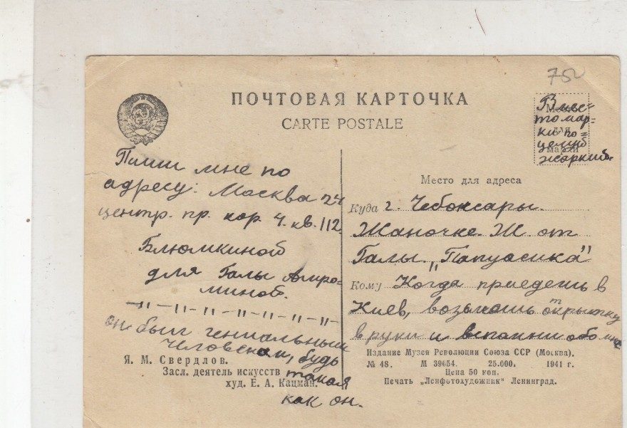 Пиши мне по адресу: Москва 24 центр[альный] пр[оспект] кор. 4 кв. 112 Блюмкиной для Галы Амроминой. -||-||-||-||-||-||-||- он был гениальным человеком, будь такая как он. {Вместо марки поцелуй жаркий.} {Когда приедешь в Киев, возьмешь открытку в руки и вспомнишь обо мне}