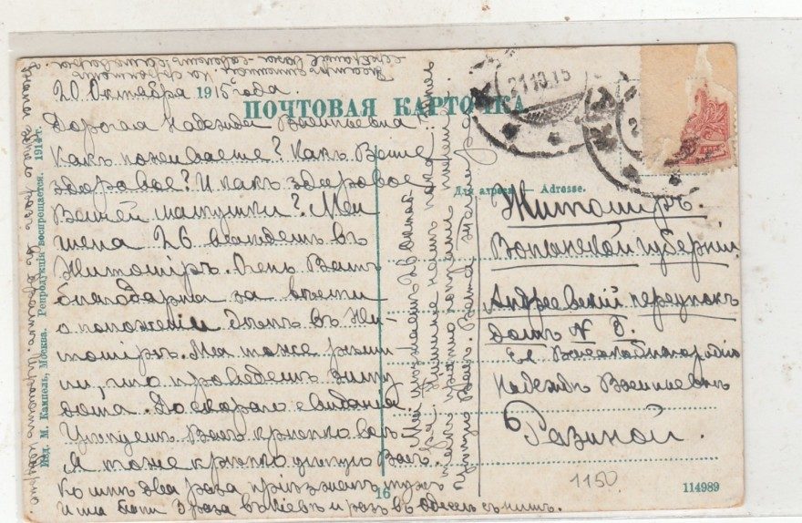 20 Октября 1915 года. Дорогая Надежда Васильевна! Как поживаете? Как Ваше здоровье? И как здоровье Вашей матушки? Мои [?Женя] 26 выедет в Житомир. Очень Вам благодарны за вести о положении дел в Житомире. [?Меа] тоже решили, что проведет зиму дома. До скорого свидания. Целуем Вас крепко все. Я тоже крепко целую Вас. Ко мне два раза приезжал [?туж] И [нрзб] 3 раза [нрзб] и раз в [нрзб] [?сънит] {Театр смешной [нрзб]} {[нрзб] раз в [?драму]. Играют недурно} {Мои уезжают 26 Октября. Пишите нам пока так приятно [нрзб] Целую Вас. Ваша Тамара}