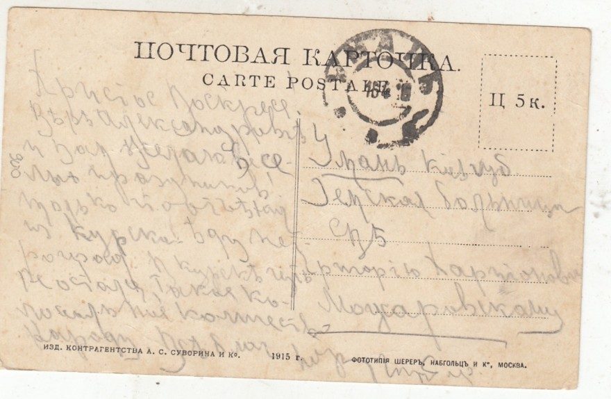 Описание открытки: Изд. контрагенства А. С. Суворина и Ко. 1915 г. Фототипия Шерер, Набгольц и Ко, Москва.