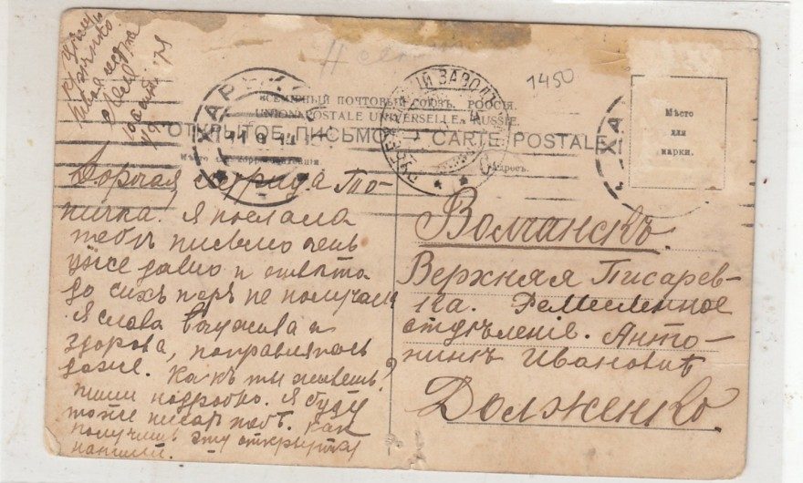 {Целую Крепко. Твоя сестра Леля. 10 сентября 14 г.} Дорогая сестрица Тоничка! Я послала тебе письмо очень уже давно и ответа до сих пор не получала. Я слава Богу жива и здорова, поправляюсь даже. Как ты живешь? пиши подробно. Я буду тоже писать тебе. как получишь эту открытку напиши.