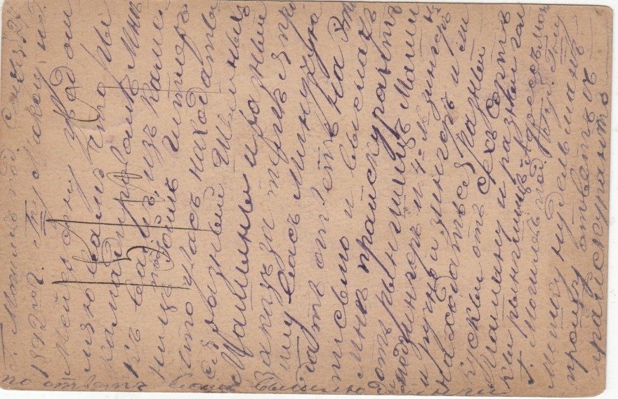 Г. Могилев под. Сентяб[рь] 27 1892го г. Гну [^Господину] Максу и Г. Мейерсону уведомляю вам что вы камадировале [^командировали] мне [^меня] к вам из Камениц-Под [^Каменец-Подольский]. Юйль Гитлер что у вас находатся [^находятся] разный [^разные] швейных [^швейные] машины и разный заказ затем я прошу вас минутую дать ответ на это письмо и выслать мне прайскурант [^прейскурант] хоть рынгшиц машин нед [^нет] зингер и 4-ль зингер и ручной зингер и ли [^или] находаться [^находятся] разный [^разные] кускы [^куски] от всех сорт машину и разны[е] голкы [? иголки] рынгшиц адрес мой г. Могилев Под. Губ. Гну [^Господину] Мошку Нудельман прошу ответ с прайскурант [^прейскурант] {по ответ[у] вам вышлю деньги}