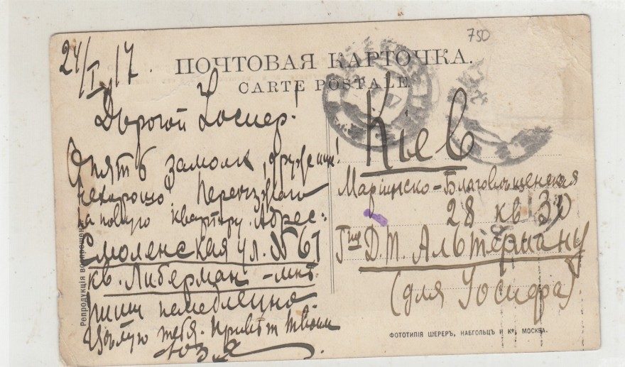 24/I 17. Дорогой Иосиф! Опять замолк, дружище! Нехорошо! Переезжаем на новую квартиру. Адрес: Смоленская ул. №61 кв. Либерман - мне. Пиши немедленно. Целую тебя. Привет твоим. Юзя.