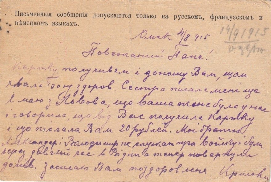 Омск 4/8 9,5 14/91915/ [?одерж] Поважаний Пане! Картку получил i доношу Вам, щом хвала Богу здоров. Сестра писала менi що я маю з Львова, що ваша жена була у нас i говорила, що вiд Вас получила Картку i що поклала Вам 20 рублей. Моi братья Александер; Володимир не служат пра войску i були перед довгий лес в Вiдни а тепер повернули домiв, засилаю Вам поздроровленя Крисаку